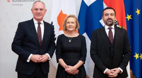O Υφυπουργός Μετανάστευσης Νικόλας Ιωαννίδης συζήτησε τις προτεραιότητες της Κυπριακής Προεδρίας στο μεταναστευτικό με τον Υπουργό Εσωτερικών της Αυστρίας Gerhard Karner και την Υπουργό Εσωτερικών της Φινλανδίας Mari Rantanen. Όπως αναφέρει ο Υφυπουργός σε σημερινή ανάρτηση στο Χ, βρέθηκε την Πέμπτη στη Βιέννη κατόπιν πρόσκλησης του Υπουργού για την διεξαγωγή της τριμερούς συνάντησης. Αναφέρει ότι η συνάντηση διεξήχθη σε εξαιρετικό κλίμα και στην ατζέντα βρέθηκαν οι προτεραιότητες της Κυπριακής Προεδρίας, η ανάγκη για αυστηρούς ελέγχους στα εξωτερικά σύνορα της ΕΕ και η ανάγκη για περισσότερους επαναπατρισμούς παράνομων αλλοδαπών. "Ξεκινάμε την Προεδρία του Συμβουλίου της ΕΕ με την ισχυρή πεποίθηση ότι θα συμβάλουμε στην προώθηση των στόχων της ΕΕ, αλλά και την παγίωση της Κυπριακής Δημοκρατίας ως πυλώνα ασφάλειας και σταθερότητας", αναφέρει ο Υφυπουργός.