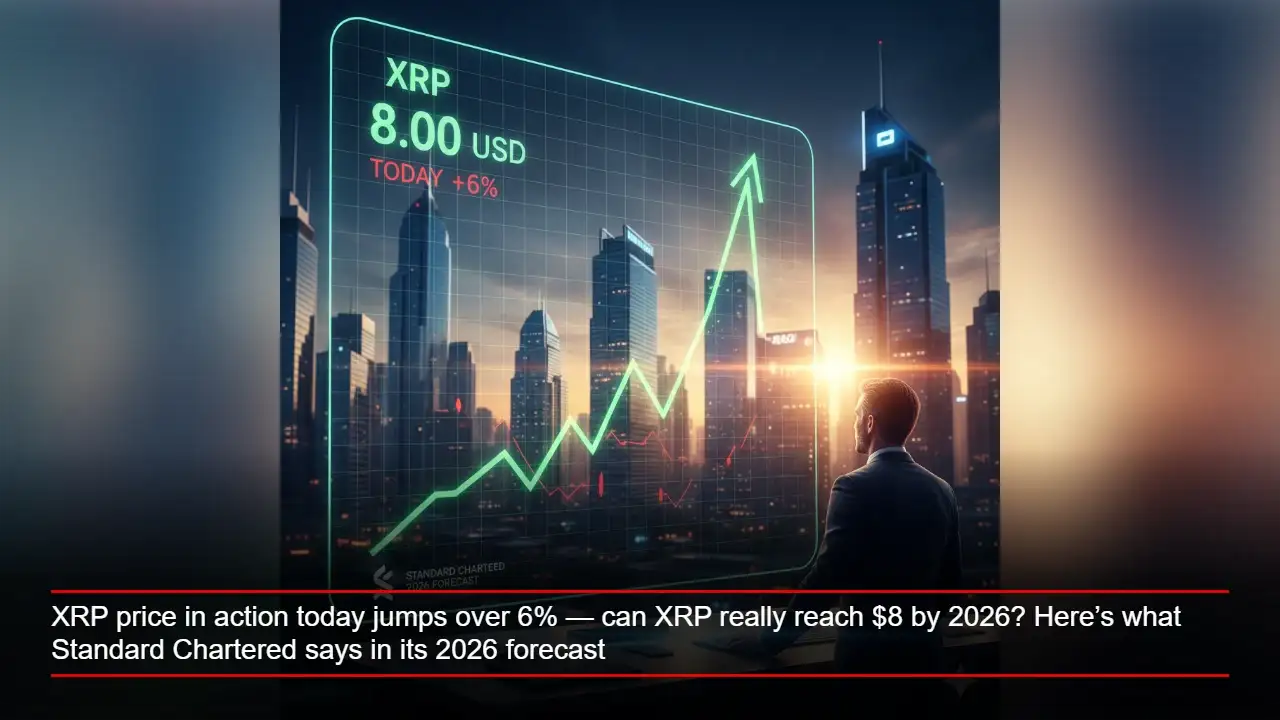 XRP price is moving again. The token jumped more than 6% today. Standard Chartered says XRP could climb to $8 by 2026. The bank argues that XRP is entering a new phase after years of legal overhang. According to its research, XRP’s upside comes from demand pressure rather than speculation. The forecast assumes $4 billion to $8 billion in spot XRP ETF inflows during 2026.