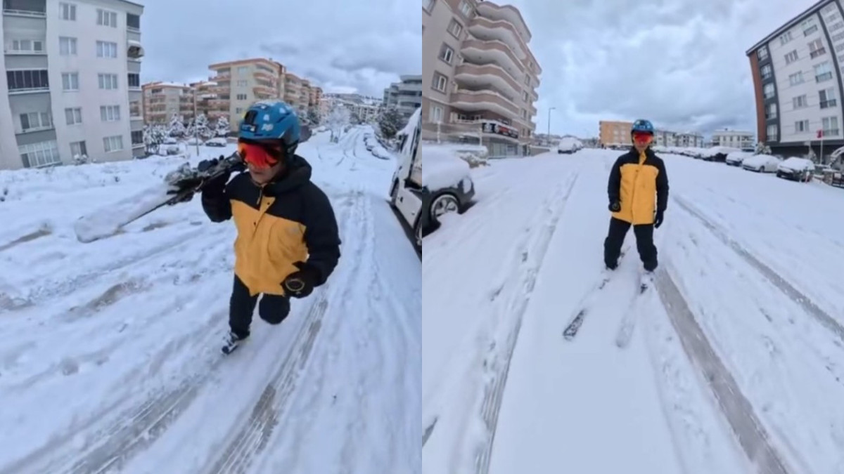 Bursa'da dün etkili olan kar yağışı sonrası bir vatandaş işe gitmek için ilginç bir yönteme başvurdu. Kayak takımlarını ayağına geçiren vatandaş, hem spor yaptı hem de keyifle işe gitmenin mutluluğunu yaşadı.