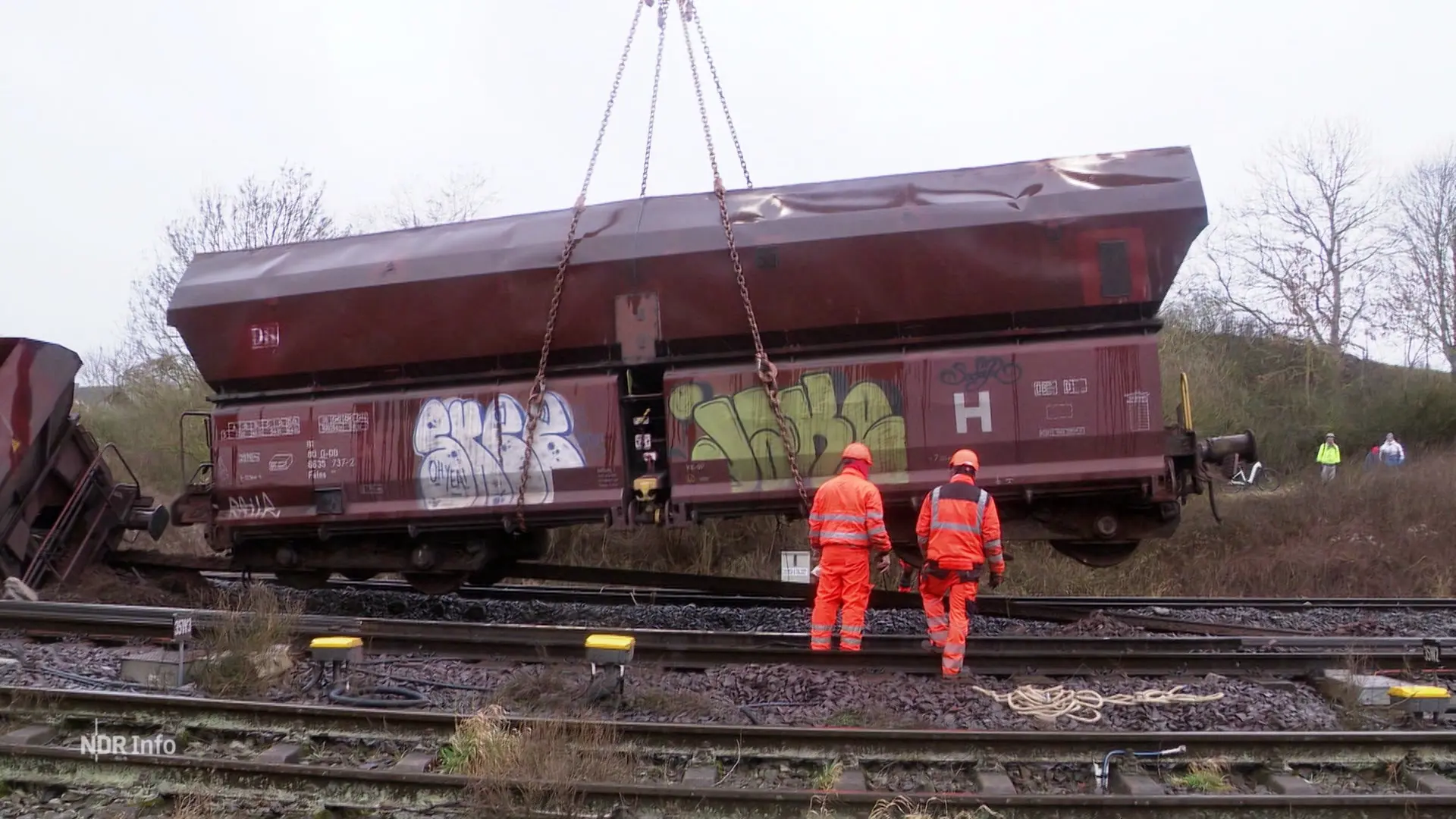 Die sieben Waggons wurden mit Kränen auf die Schienen gesetzt. Als nächstes sollen die Schäden an der Bahnstrecke beseitigt werden.