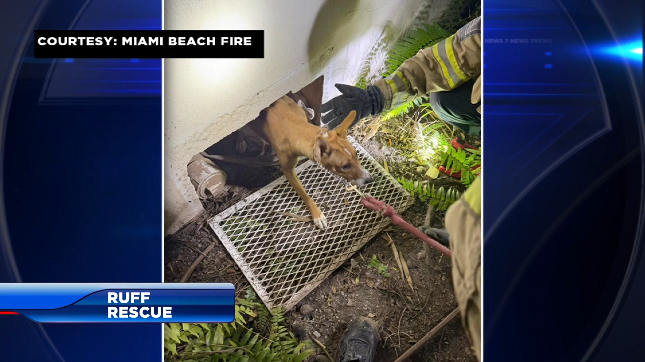 A team of firefighters made a ruff rescue after a puppy got tangled up in some plumbing underneath a building in Miami Beach. Photos provided...