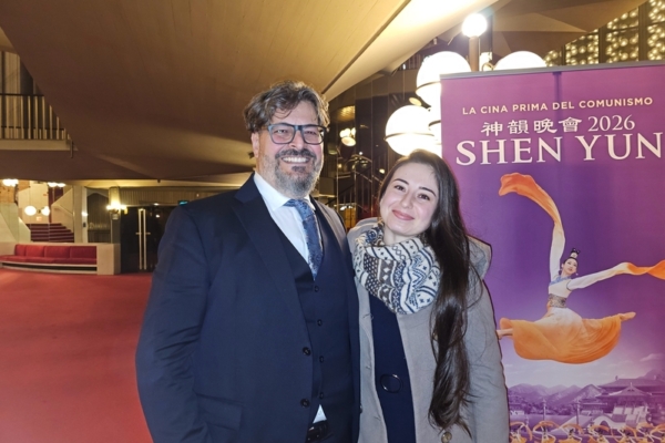 2026年1月2日晚上,专案经理兼软体分析师Roberto Pasciuti和太太Ayisha Mahmudova一同观看了神韵纽约艺术团在都灵王家剧院(Teatro Regio Torino)的第三场演出。(Massimo Marcon/大纪元)