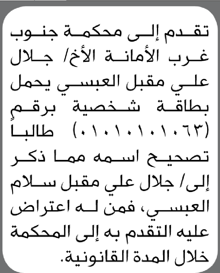 تعلن محكمة جنوب غرب الأمانة أن الأخ جلال العبسي تقدم بطلب تصحيح اسمه