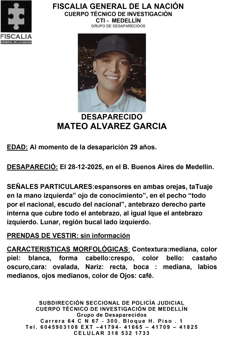 Fue visto por última vez el 28 de diciembre de 2025 en el barrio Buenos Aires de Medellín