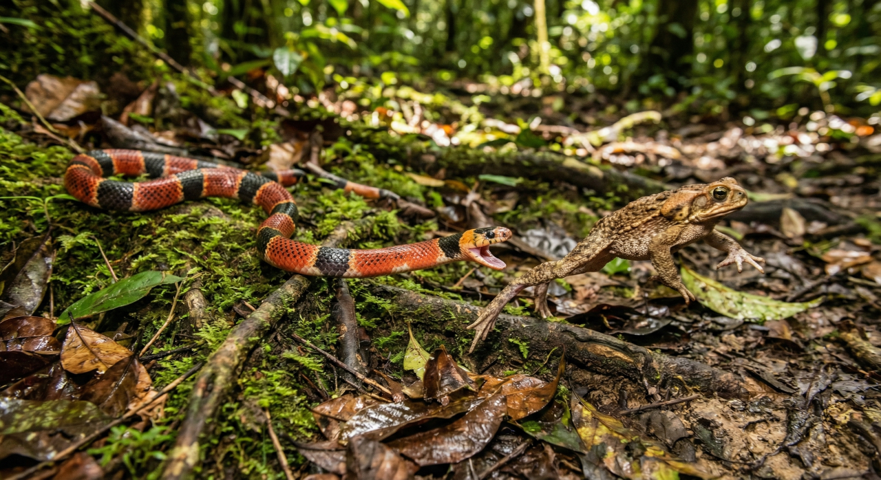Sapo vira janta de cobra após tentar fugir e ficar cansado
