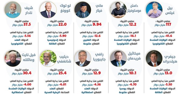 شهد عام 2025 تقلبات كبيرة في ثروات أغنى رجال العالم، حيث لم يستفد الجميع من طفرة الأسواق والابتكارات التكنولوجية، وفقًا للقائمة التي رصدها فريق البلاد، تكبد عدد من المليارديرات خسائر ضخمة، كان أبرزهم بيل غيتس الذي فقد حوالي 41.6 مليار دولار، وتلاه آخرون مثل مانويل فيلار وداستن موسكوفيتز ومايك كانون ، بروكس، ممن شهدت ثرواتهم تراجعًا ملحوظًا منذ بداية العام. تنوعت قطاعات هؤلاء الخاسرين بين التكنولوجيا والطاقة والرعاية الصحية والسلع الاستهلاكية، وشملت دولًا عدة أبرزها الولايات المتحدة والهند والفلبين وأستراليا وإندونيسيا وروسيا. جاءت هذه الخسائر نتيجة عدة عوامل اقتصادية وسوقية، منها تذبذب أسواق الأسهم، التضخم المرتفع، ارتفاع أسعار الفائدة، والرسوم الجمركية، إضافة إلى التطورات السريعة في الذكاء الاصطناعي التي أثرت على بعض الاستثمارات، كما أن التغيرات في أسواق الطاقة والتجارة العالمية ساهمت في تراجع قيمة بعض الشركات الكبرى، مما انعكس مباشرة على صافي ثروة أصحابها.