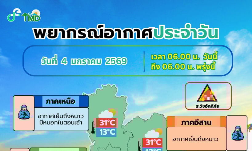4 มกราคม 2569 พยากรณ์อากาศ 24 ชั่วโมงข้ […] The post อุตุฯเผยมวลอากาศเย็นระลอกใหม่พัดปกคลุมไทยตอนบนและภาคใต้ตอนบน appeared first on .