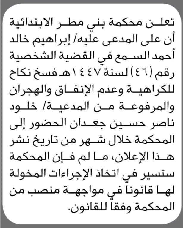 تعلن محكمة بني مطر الابتدائية بأن على/ إبراهيم خالد السمع الحضور إلى المحكمة