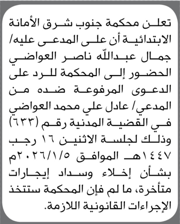 تعلن محكمة جنوب شرق الأمانة بأن على/ جمال عبدالله العواضي الحضور إلى المحكمة