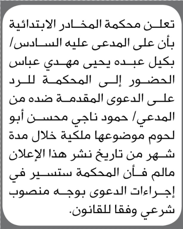 تعلن محكمة المخادر الابتدائية بأن على/ بكيل عبده عباس الحضور إلى المحكمة