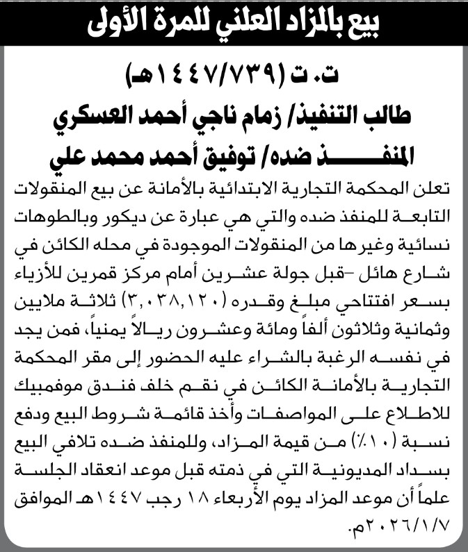 تعلن المحكمة التجارية بالأمانة عن بيع المنقولات التابعة للمنفذ ضده توفيق أحمد