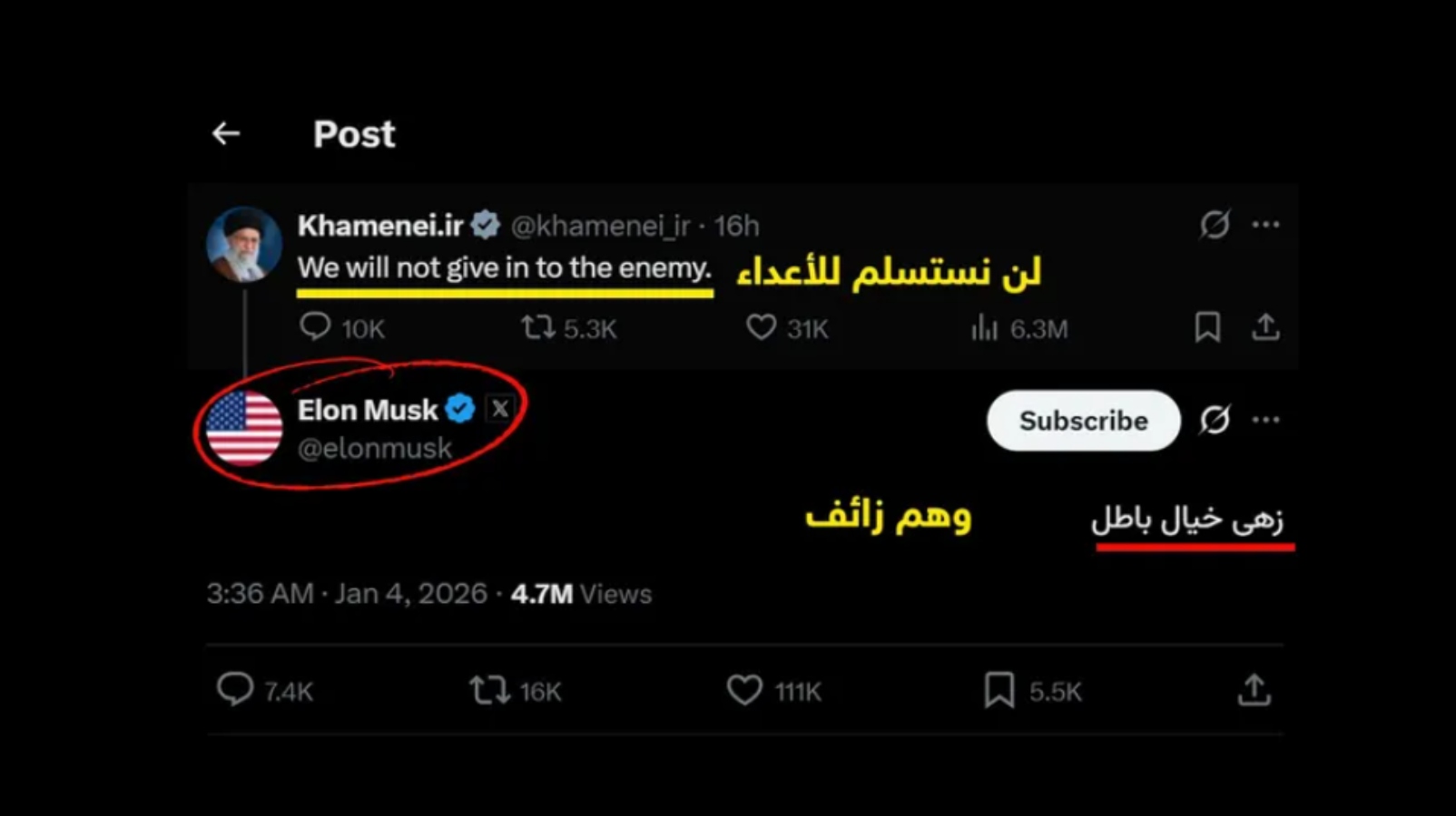 سجال على "إكس" بين خامنئي وماسكنشر المرشد الإيراني علي خامنئي، السبت، سلسلة تغريدات باللغة الإنجليزية على منصة إكس، تناولت على الأغلب التصريحات الأميركية حول الاحتجاجات الشعبية في إيران...