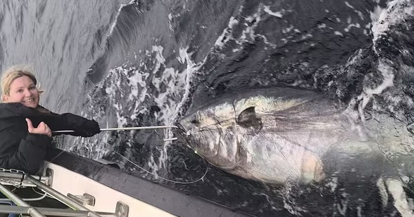Sau hơn 1 giờ vật lộn, cô gái trẻ đã bắt được con cá ngừ vây xanh khổng lồ nặng 344kg, dài 2,7 mét.