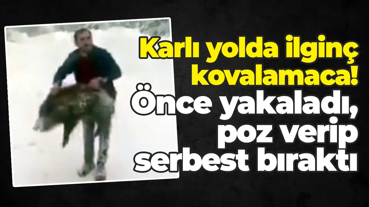 Sinop’un Erfelek ilçesinde karla kaplı yolda seyir halindeki sürücü, karşılaştığı yaban domuzunu önce otomobille, ardından yaya olarak kovalayıp, yakaladı. Birlikte görüntü çektirdikten sonra salıverdi.