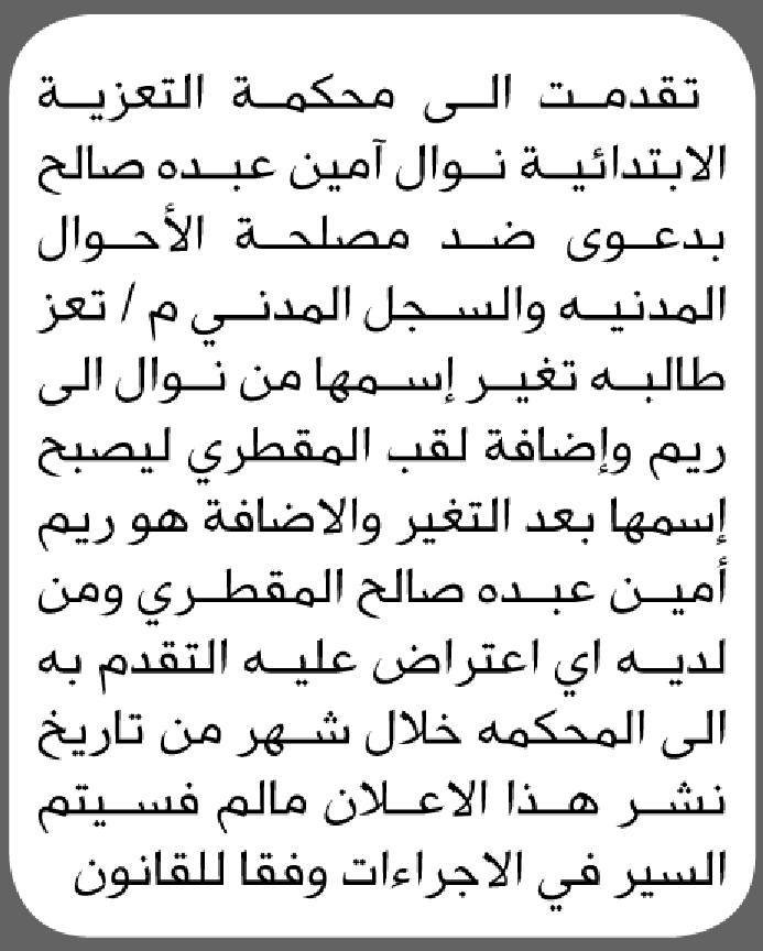تعلن محكمة التعزية الابتدائية بأن الأخت/ نوال أمين صالح تقدمت إليها بطلب تغيير اسمها