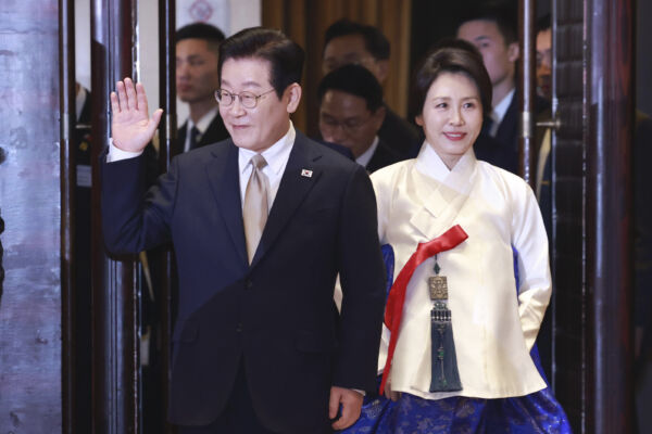 韩国总统李在明与夫人金惠景1月4日在北京一家酒店出席旅中韩国人座谈会时入场。(韩联社)