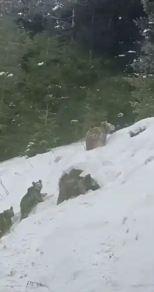 Artvin'de Kış Uykusuna Yatmayan Dört Boz Ayı Yolda Görüntülendi
