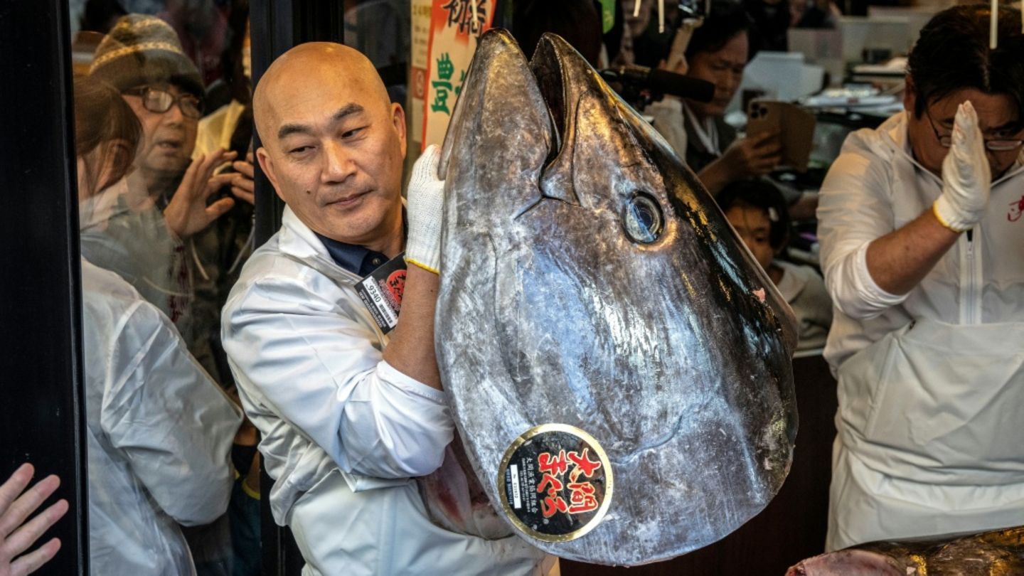 Ein Mann präsentiert den Kopf eines 243 Kilogramm schweren Blauflossenthunfisch, den ein japanischer Sushi-Unternehmer bei der Neujahrsauktion auf dem Tokioter Fischmarkt Toyosu für einen Rekordpreis von umgerechnet rund 2,8 Millionen Euro ersteigert hat.