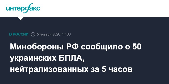 Минобороны РФ сообщило о 50 украинских БПЛА, нейтрализованных за 5 часов