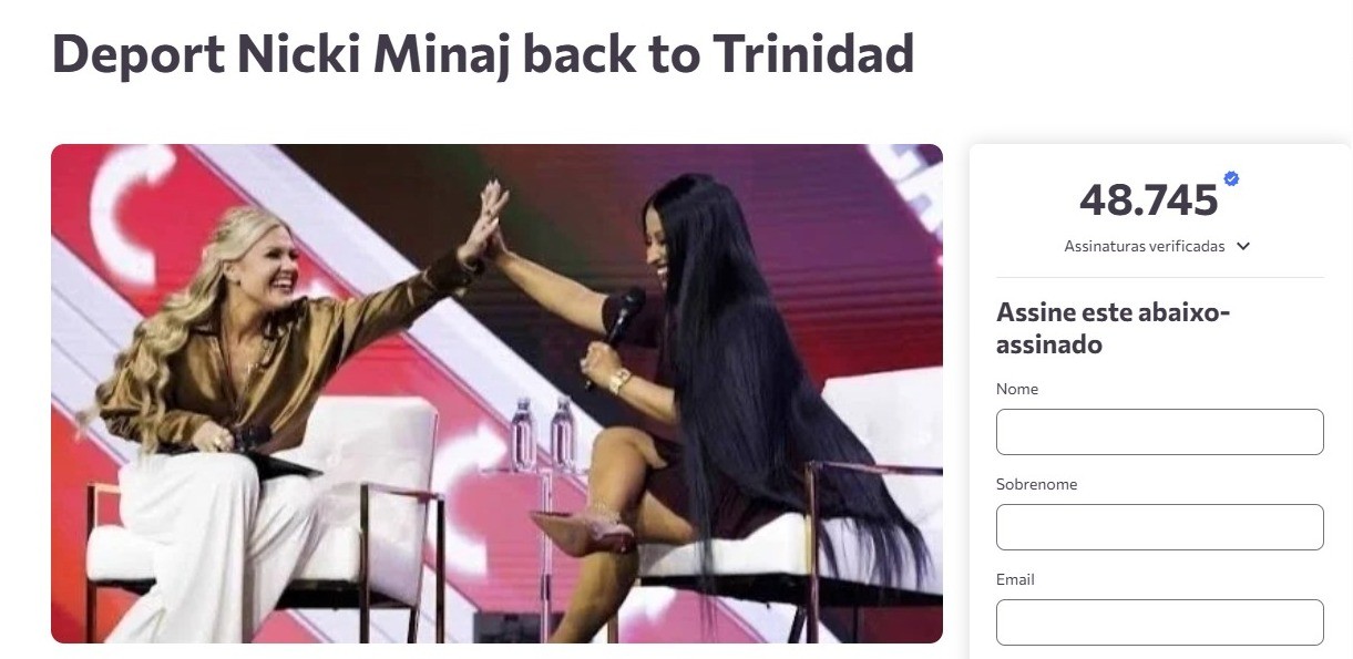 Nicki Minaj passou a ser alvo de pedidos de deportação nos Estados Unidos após se aproximar publicamente de pautas do conservadorismo americano e elogiar o presidente Donald Trump. Petições criadas na plataforma Change.org somam mais de 120 mil assinaturas solicitando que a rapper seja enviada de volta a Trinidad e Tobago, país onde nasceu. A mais popular delas foi lançada em julho de 2025, reúne cerca de 83 mil apoios e ganhou força nas últimas semanas depois das aparições públicas da artista ao lado de figuras ligadas à direita americana. Entenda: Nicki Minaj enfrenta onda de cancelamento após elogiar Donald Trump Saiba mais: Nicki Minaj desiste de lançar novo álbum após acusações contra Jay-Z e causa alvoroço nas redes Uma segunda petição, criada em 27 de dezembro de 2025 e assinada por mais de 48 mil pessoas, afirma que a postura recente da cantora teria causado frustração entre fãs e antigos admiradores. “As ações e palavras de Nicki Minaj tomaram um rumo que deixou muitos de seus apoiadores se sentindo profundamente traídos”, escreveu o autor do texto, Tristan Hamilton. “Deportá-la de volta a Trinidad serviria como um lembrete de que figuras públicas precisam ser responsabilizadas pelo impacto mais amplo de seus discursos.” Imagem da página pedindo deportação da rapper Repropdução O movimento ganhou força após a participação de Nicki no AmericaFest, principal convenção anual do Turning Point USA, realizada em dezembro. No evento, a rapper subiu ao palco de mãos dadas com Erika Kirk, viúva do ativista conservador Charlie Kirk, assassinado no início do ano, e agradeceu o convite enquanto sua música “Super Bass” tocava ao fundo. “Estou honrada de estar aqui, obrigada por me receberem”, disse a cantora. Em declarações feitas durante o evento, Minaj também elogiou Donald Trump e o vice-presidente J.D. Vance, afirmando que “ama os dois”. Apesar do movimento nas redes, a legislação americana não prevê deportação por manifestação de opinião política. “Criticar políticas públicas ou expressar posicionamentos ideológicos é protegido pela Primeira Emenda, independentemente do status migratório”, afirma entendimento reiterado pela União Americana pelas Liberdades Civis (ACLU). A controvérsia marca uma mudança em relação ao histórico da artista. Em 2020, Nicki Minaj declarou que não pretendia apoiar Donald Trump e criticava as políticas anti-imigração do então presidente. Imigrante, ela nasceu como Onika Tanya Maraj, em Trinidad e Tobago, e se mudou ainda criança para o Bronx, em Nova York, onde viveu por anos em situação irregular. Em 2018, usou as redes sociais para condenar a política de separação de famílias na fronteira. “Vim para este país como imigrante ilegal. Não consigo imaginar o horror de estar em um lugar estranho e ter meus pais arrancados de mim aos 5 anos”, escreveu à época, em publicação posteriormente apagada. Nos últimos meses, porém, a cantora passou a adotar um discurso alinhado a pautas conservadoras. Durante o AmericaFest, declarou admirar Trump e Vance e afirmou que ambos conseguem dialogar com “pessoas comuns”. A presença ao lado de Erika Kirk reforçou a associação com o movimento conservador e intensificou a repercussão negativa. A reação entre fãs foi imediata. Usuários anunciaram boicotes, deixaram de segui-la nas redes sociais e passaram a questionar a coerência do posicionamento adotado com a trajetória construída ao longo da carreira. Minaj, que durante anos esteve associada a pautas ligadas à diversidade, à comunidade LGBTQIA+ e a debates raciais, passou a ser acusada de se alinhar a discursos considerados excludentes. O desgaste se intensificou após falas e publicações interpretadas como transfóbicas, reacendendo críticas antigas. O reposicionamento também gerou respostas no meio artístico. A cantora Kim Petras publicou mensagens em defesa de crianças trans após declarações de Minaj ganharem repercussão negativa, enquanto Tammy Rivera criticou a participação da rapper em eventos conservadores. O comediante D.L. Hughley também se manifestou, apontando contradições entre o discurso atual da artista e sua trajetória dentro da cultura hip hop.