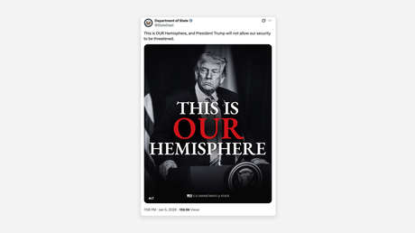 El Departamento de Estado de EE.UU. ha publicado este lunes una imagen de Donald Trump acompañada de un inquietante mensaje. "Este es nuestro hemisferio", afirma el organismo, agregando que el presidente estadounidense "no permitirá que nuestra seguridad se vea amenazada".