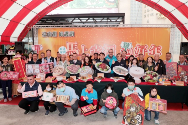 “台南庇护年节礼”开卖,由来宾进行启动仪式。(南市府提供)