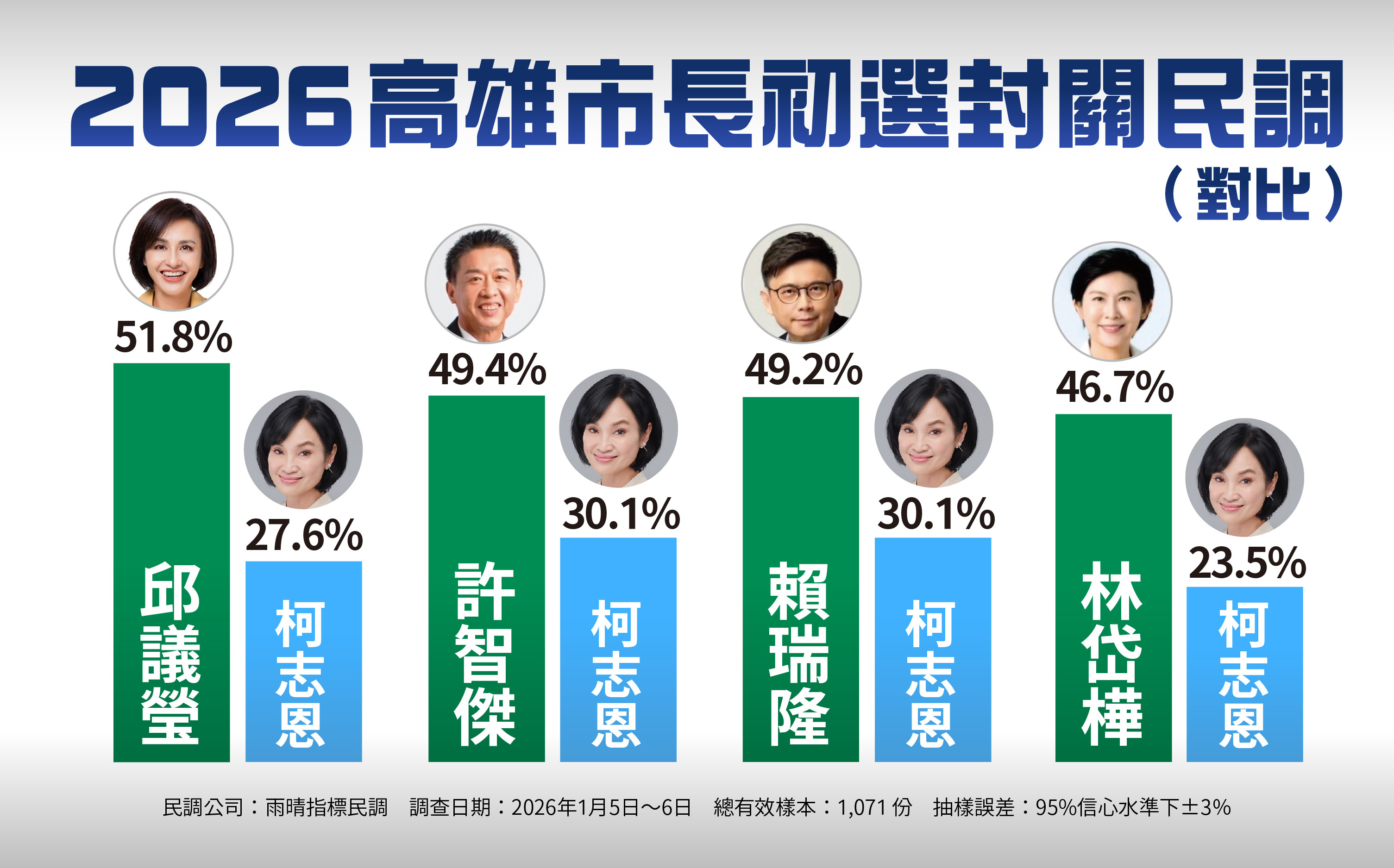 Newtalk新聞 民進黨將在本月中旬舉行高雄市長黨內初選, 根據封關前最新民調顯示,立委邱議瑩在「對比式」與「互比式」民調中皆暫居第一,成為目前領先者 ;在對比式民調中對上國民黨柯志恩時,支持度更是突破五成,互比中則以 20.8% 居冠。許智傑則排名第二;林岱樺雖在互比式拿下第二,但整體聲勢受助理費爭議影響;賴瑞隆疑因霸凌案處置爭議聲勢有些下滑。 民進黨預計於下週進行高雄市長初選民調。對此,根據一份綠營內部人士在封關前掌握的最新民調顯示,四名參選人中,邱議瑩不論在對比式或互比式調查中,皆呈現單獨領先的態勢。值得注意的是,在對比結果方面,許智傑以些微差距領先賴瑞隆,林岱樺則居於末位;至於互比部分,林岱樺排名第二,領先賴瑞隆與許智傑。 根據民進黨初選規定,初選所採是對比式民調。其中,邱議瑩對柯志恩是51.8%與27.6%,未表態20.7%;許智傑對柯志恩是49.4%與30.1%,未表態20.4%;賴瑞隆對柯志恩是49.2%與30.1%,未表態20.8%;林岱樺對柯志恩是46.7%與23.5%,未表態為29.8%。雖然四位候選人中邱議瑩都取得領先地位,不過四位民進黨候選人都領先國民黨的柯志恩。 另一方面,若是用互比式民調,邱議瑩則已20.8%的支持度,領先林岱樺的18.5%、賴瑞隆的18.0%與許智傑的8.3%,未表態則是34.4%。從對比式跟互比式民調中可以發現,邱議瑩都單獨位居第一。 據高雄地方人士透露,邱議瑩在最後階段展現出爆發力與衝刺力,主打「市長牌」,強調延續高雄市長陳其邁高滿意度施政,成功激起綠營支持者的熱情,讓聲勢從鳳山區大造勢、政見會後持續看漲,並且透過與立委黃捷等高人氣明星合體的全市大車掃,逐漸拉開與其他候選人的差距。 至於立委許智傑方面,地方人士分析,他憑藉深耕鳳山多年的在地人脈,以及持續勤跑基層的策略,使其在選戰後期逐步打開「AI小金剛」的知名度;再加上成功促成媽祖繞境,以及 LaLaport 大型商場即將開幕的政績加持,讓許智傑的整體聲勢呈現後來居上的態勢。 在賴瑞隆與林岱樺部分,熟悉高雄這場選舉的綠營人士指出,林岱樺在助理費案爆發後,聲勢便逐步往下滑,即使透過幾場大規模造勢,仍無法拉抬聲勢,只能保住基本盤支持度。而賴瑞隆則疑似霸凌案中因初步處置不當,甚至讓另一方家長感到不受尊重,可能影響了學生家長族群觀感,這是聲勢下滑最大關鍵。 這次調查由雨晴民調公司進行,抽樣方法採分層比例隨機抽樣法。以中華電信高雄市電話住宅用戶為抽樣母體,依據比例樣本配置法分配區域樣本數,採分層比例隨機抽樣法選取住宅電話樣本。同時為了使原始未登錄的電話號碼也有機會被抽出,將同時採後二碼隨機的方式抽取電話樣本。訪問對象為調查區域內年滿20歲以上之成年民眾。訪問日期為115年1月5日至6日。訪問時間為晚間6點30分至10點。總有效樣本為1,071份。抽樣誤差在95%的信心水準下,約±3.0 個百分點。以SPSS19.0統計軟體進行資料分析,並依據高雄市民政局 114 年 9 月底人口統計資料,針對行政區、年齡與性別進行統計加權處理。 延伸閱讀: 民進黨創黨40週年 賴清德大談心內話:我誠惶誠恐帶領黨 憲妃激戰下週執行民調!民進黨下多項禁令:9日起不得媒體露出 劉世芳等人遭列台獨頑固分子 外交部:配合中國舉報者應受法律制裁 獲藝人接力表態支持 邱議瑩:開創高雄演唱會經濟2.0 邱議瑩政見會震撼全場 名嘴評:2.0升級、市民最好選擇