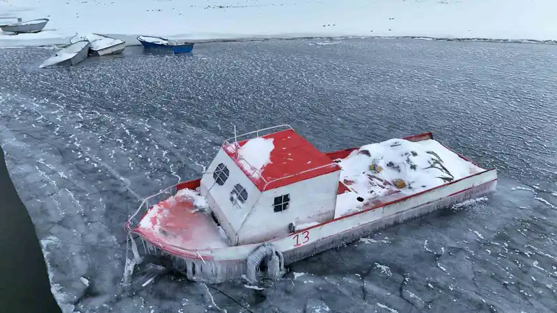 nazik gölü kısmen dondu, balıkçı tekneleri buzlar arasında kaldı