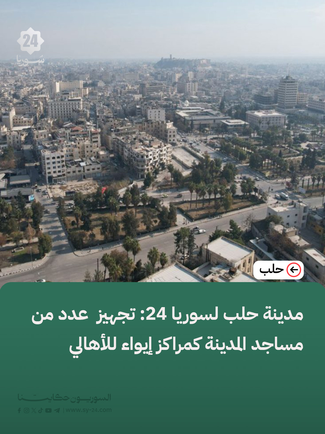 مدير مكتب العلاقات في الكتلة الأولى بمدينة حلب رامي كلزي لسوريا 24: جرى تجهيز عدد من المساجد في مدينة حلب لاستقبال الأهالي وتأمين مأوى مؤقت لهم بالتعاون مع الجهات المحلية والمجتمع الأهلي. مراكز الإيواء في الكتلة الأولى شملت أحياء أقيول وحارة الريشي عبر مسجد النوحية وقسطل الزيتون، وحي القصيلة عبر مساجد الطروش والطواشي […] The post مدينة حلب لسوريا 24: تجهيز عدد من مساجد المدينة كمراكز إيواء للأهالي appeared first on SY24 .