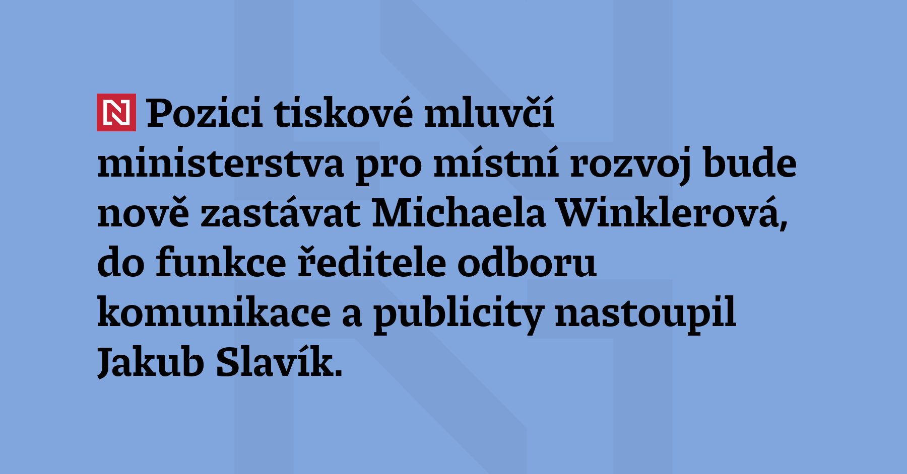 Pozici tiskové mluvčí ministerstva pro místní rozvoj bude nově zastávat Michaela Winklerová, do funkce ředitele odboru komunikace a publicity nastoupil Jakub Slavík. Ministerstvo o tom informovalo v tiskové zprávě.