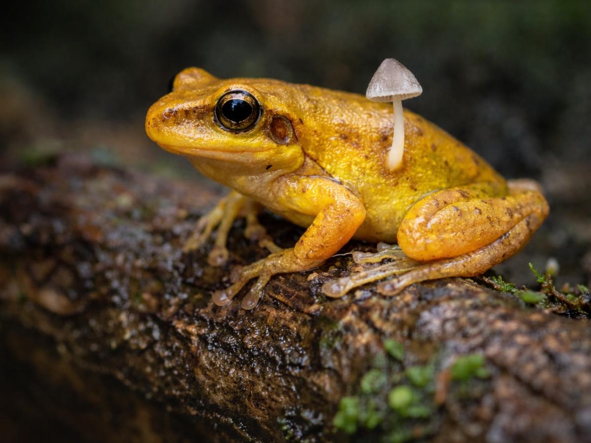 Учёные столкнулись с находкой, которая выглядит почти фантастически: на теле живой лягушки обнаружили растущий гриб. Земноводное при этом выглядело здоровым и активно передвигалось. Подобных случаев раньше не фиксировали, поэтому исследование вызвало большой интерес у биологов и микологов. Необычное наблюдение в дикой природе Редкий случай был зафиксирован в Индии, в предгорьях хребта Кудремукха. Среди нескольких десятков лягушек одного вида исследователь заметил особь, у которой из боковой части тела торчал белый гриб с сероватой шляпкой. Речь идёт о промежуточной золотисто-спинной лягушке Рао — небольшом земноводном, обитающем в Западных Гатах. Лягушку не изымали из среды обитания, поэтому наблюдения ограничились визуальной фиксацией и фотографиями. Что это за гриб и откуда он взялся После публикации снимков микологи предположили, что гриб может относиться к роду Mycena. Эти грибы обычно растут на мёртвой древесине и разлагающихся растительных остатках, а не на живых организмах. Именно поэтому находка считается беспрецедентной.