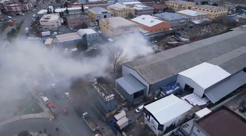 gaziosmanpaşa’da avize atölyesinin deposunda yangın çıktı: ekiplerin söndürme çalışması havadan görüntülendi