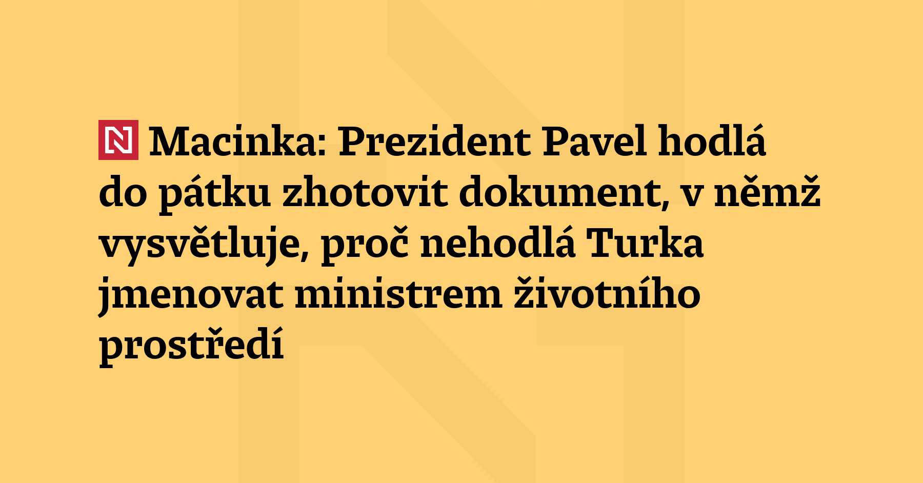 Ministr zahraničí Petr Macinka (Motoristé) dnes dvacet minut telefonoval s prezidentem Petrem Pavlem. Prezident Macinkovi řekl, že zhruba do pátku hodlá zhotovit dokument, v němž vysvětluje, proč nehodlá jmenovat Filipa Turka ministrem životního prostředí. Macinka to řekl v Interview ČT24.