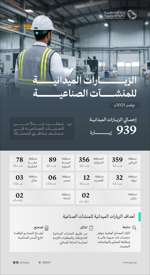 نفذت وزارة الصناعة والثروة المعدنية، ممثلة في وكالة الخدمات والامتثال الصناعي 939 زيارة ميدانية على المنشآت الصناعية في المملكة خلال شهر نوفمبر الماضي، لمتابعة التزام المصانع بالاشتراطات والمتطلبات اللازمة لممارسة النشاط الصناعي، واتخاذ الإجراءات النظامية بحق المنشآت المخالفة،