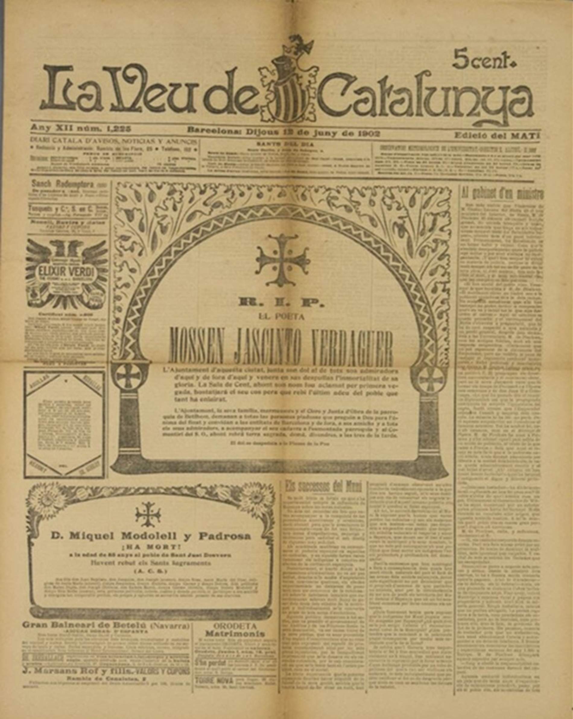 Tal dia com avui de l’any 1938, fa 88 anys, a Barcelona, sortia al carrer la darrera edició del diari La Veu de Catalunya , fundat per Enric Prat de la Riba a finals del 1898. Durant els seus 38 anys d’existència —des de la seva primera publicació, l’1 de gener del 1899, fins a la darrera, el 8 de gener del 1938—, va sortir cada dia en dues edicions (matí i tarda). Va ser el portaveu ideològic i polític de la Lliga Regionalista , el partit polític hegemònic a Catalunya durant bona part del primer quart del segle XX (1907-1923) i el que va governar la Mancomunitat durant els anys de l’existència d’aquest organisme (1914-1923). La Veu de Catalunya va tenir una línia editorial conservadora, autonomista i defensora de l'ús públic del català i de l’escola catalana . Des del punt de vista periodístic, va ser un diari modern, ordenat per seccions, amb corresponsals i col·laboradors al territori i amb un equip que combinava gent jove i els millors periodistes de l’època . La seva capçalera, dissenyada per l’arquitecte modernista Lluís Domènech i Muntaner , mostrava una àliga quadribarrada. Durant la seva existència va ser, amb La Vanguardia i el Correo Catalán , un dels tres diaris més importants del país i el més llegit en llengua catalana . El 1905 va patir, juntament amb el setmanari satíric ¡Cu-cut! , l’assalt i el saqueig a mans d’un grup de 300 oficials de l’exèrcit espanyol, que van destruir totalment la redacció i les màquines de maquetació . Tot i això, la reacció de la societat catalana del moment va ser de suport, i des de pràcticament l’endemà mateix va continuar publicant. Però el 1936, amb l’esclat de la Guerra Civil espanyola, va ser usurpat pel sindicat anarquista CNT-FAI , que el va obligar a modificar la línia editorial. Després de la derrota dels anarquistes a la guerra urbana coneguda com els Fets de Maig del 1937, el diari s’esmorteiria fins a la seva desaparició.