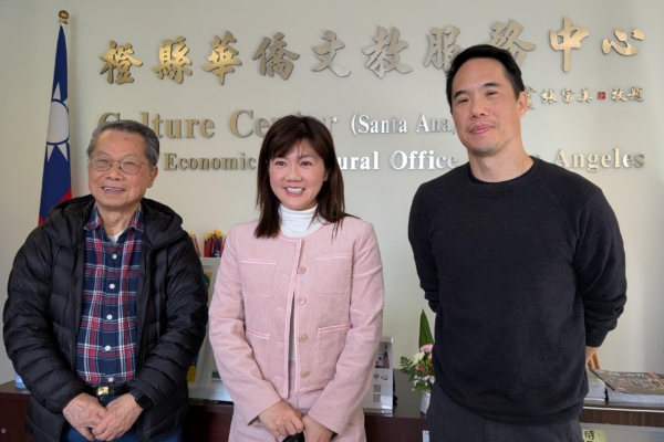 2026年1月1日,游朝凯(右)与父亲游铭泉(左)参与橙侨中心新年团拜,与橙侨中心主任萧蓓如(中)合影。(徐曼沅/大纪元)