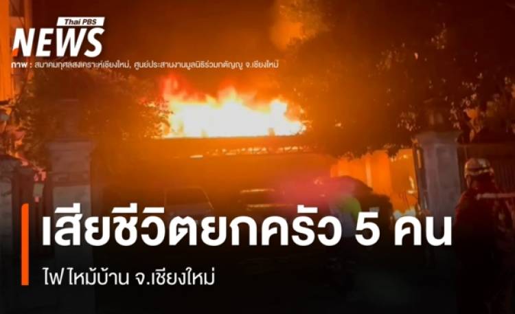 วันนี้ (8 ม.ค.2569) ผู้สื่อข่าวรายงานว่า เกิดเหตุเพลิงไหม้บ้านแฝด 2 ชั้น ภายในซอยเรือนคำ 17 ต.ป่าแดด อ.เมืองเชียงใหม่ โดยมีผู้อยู่อาศัยติดอยู่ภายใน 5 คนประกอบด้วย สามีภรรยา เด็กผู้หญิงฝาแฝด และผู้สูงอายุเพศหญิง 1 คน เจ้าหน้าที่ดับเพลิงและหน่วยกู้ภัยหลายหน่วย ระดมกำลังเข้าช่วยเหลืออย่างเร่งด่วน พร้อมทั้งนำผู้ประสบเหตุออกมาจากตัวบ้านได้ทั้งหมด โดยได้ปั๊มหัวใจ หรือ CPR ช่วยชีวิตในที่เกิดเหตุ ก่อนนำส่งโรงพยาบาลมหาราชนครเชียงใหม่ แต่ทั้งหมดเสียชีวิตในเวลาต่อมา ทั้งนี้ ใช้เวลาควบคุมเพลิงประมาณ 1 ชั่วโมง พบว่าตัวบ้านได้รับความเสียหายอย่างหนัก เจ้าหน้าที่ฝ่ายปกครองอำเภอเมืองเชียงใหม่ได้เข้าตรวจสอบพื้นที่เกิดเหตุ เบื้องต้นสันนิษฐานว่าสาเหตุจากไฟฟ้าลัดวงจร และเป็นช่วงเวลาที่ผู้อยู่อาศัยทั้งหมดอยู่ระหว่างการนอนหลับ ทำให้หนีออกมาไม่ทัน อย่างไรก็ตาม เจ้าหน้าที่พิสูจน์หลักฐานจะเข้าตรวจสอบหาสาเหตุของเพลิงไหม้ที่แน่ชัดต่อไป อ่านข่าว : พบแล้ว "พลายชมวิว" ไม่มีบาดแผลรุนแรง หลังหายตัวเข้าป่าเหตุถูกรถชน วัดอรุณราชวราราม ออกแถลงการณ์ กรณีช่างภาพบริการถ่ายภาพภายในวัด สหรัฐฯ ประท้วงเจ้าหน้าที่ ICE ยิงหญิง 37 ปีเสียชีวิตในรถ