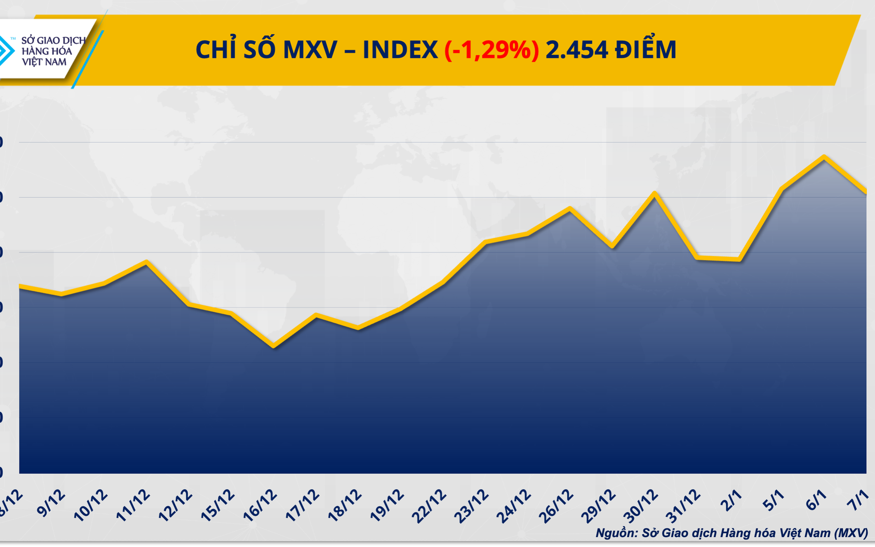 (Chinhphu.vn) - Diễn biến trái chiều của cán cân cung - cầu đã tạo nên sự phân hóa rõ nét trên thị trường hàng hóa trong phiên giao dịch ngày 7/1. Tâm điểm đổ dồn vào đà giảm sâu của giá bạch kim khi thị trường dự báo chuyển sang trạng thái thặng dư, đối lập hoàn toàn với nhịp tăng mạnh của nhóm nông sản trước những lo ngại về nguồn cung lúa mì mùa đông tại Mỹ. Chốt phiên, chỉ số MXV-Index giảm gần 1,35% xuống mức 2.454 điểm.