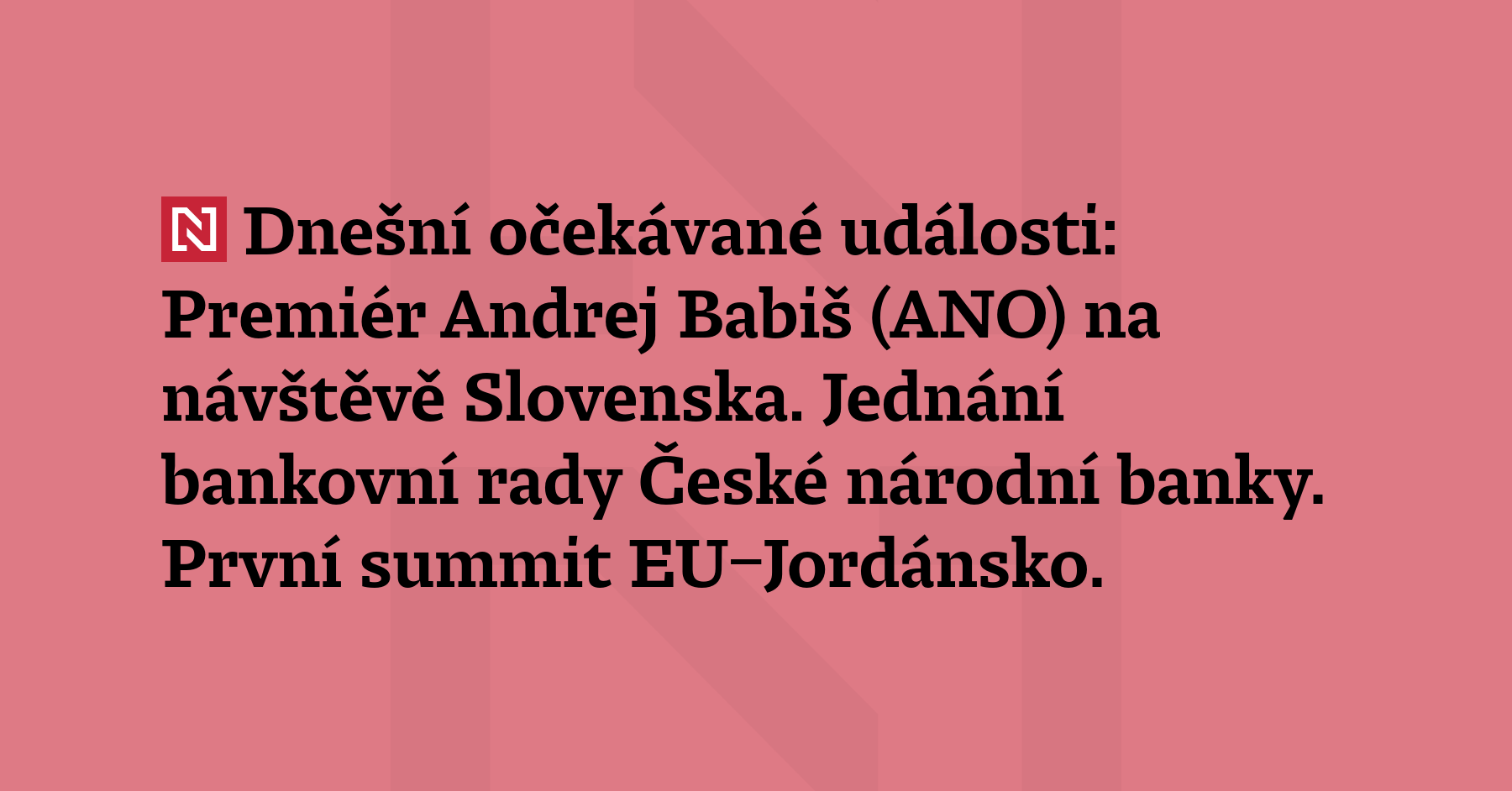 Dnešní očekávané události: Premiér Andrej Babiš (ANO) na návštěvě Slovenska. Jednání bankovní rady České národní banky. První summit EU–Jordánsko. Evropskou unii bude zastupovat předseda Evropské rady António Costa a šéfka Evropské komise Ursula von der Leyen, Jordánsko král Abdalláh II.