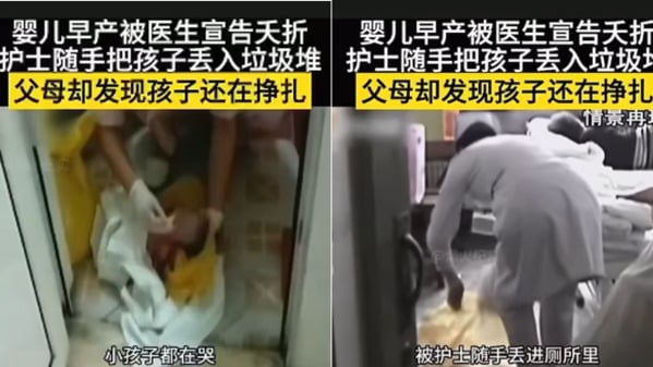 中国广东省佛山市一家医院的护士把早产婴儿随手丢进垃圾袋里,宣告夭折。但家属执意要打开垃圾袋看,结果发现孩子还活着,而且不是医生所说的女婴,而是男婴。