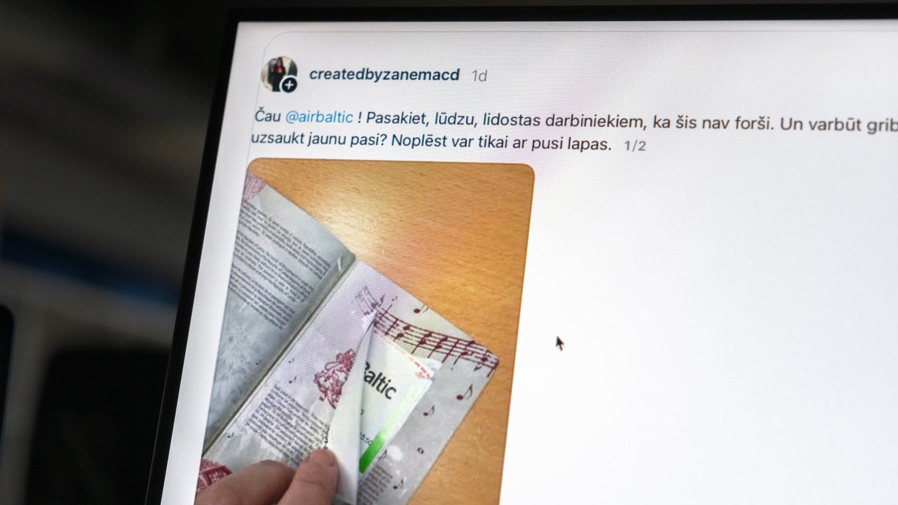 ""airBaltic", pasakiet, lūdzu, lidostas darbiniekiem, ka šis nav forši. Un varbūt gribat man uzsaukt jaunu pasi?" šādu ierakstu interneta platformā "Threads" publicējusi kāda lietotāja. Ierakstam pievienota fotogrāfija, kurā redzama pasē ielīmēta bagāžas uzlīme, kas dokumentu sabojājusi.