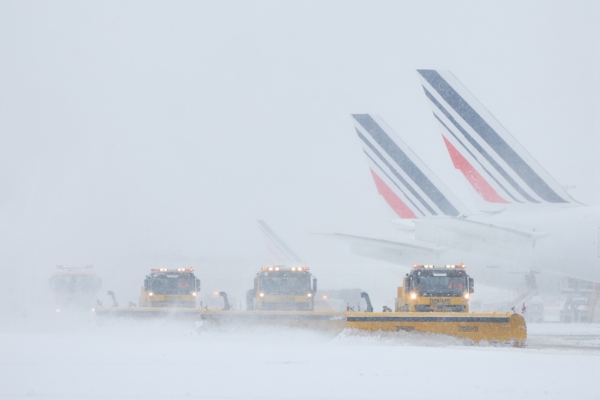 2026年1月7日,巴黎南部奥利机场,数辆清雪机在清理跑道上厚厚的积雪。(Kiran Ridley/AFP via Getty Images)