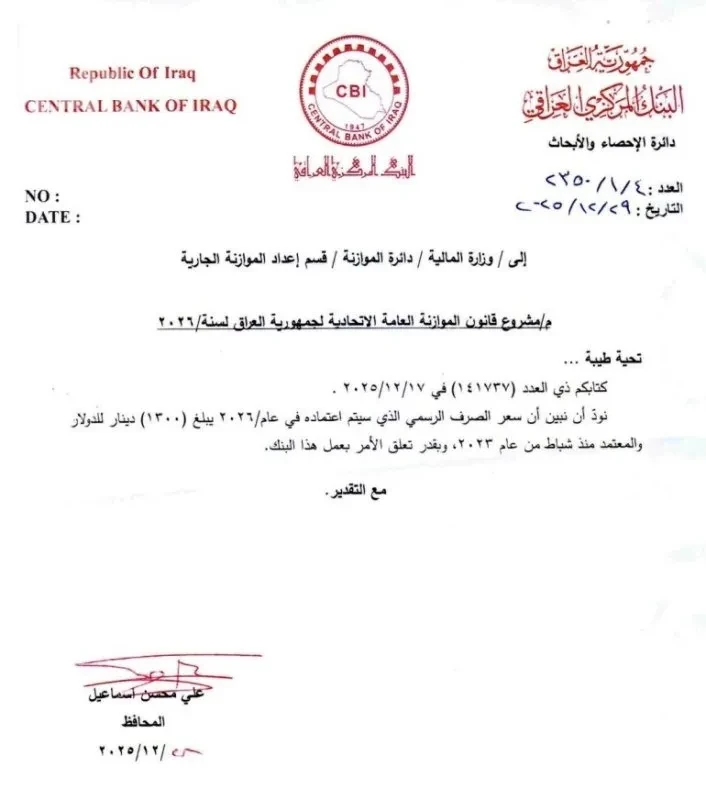 بغداد/المدى أعلن البنك المركزي العراقي، اليوم الخميس، أنه سيعتمد سعر الصرف الرسمي عند 1300 دينار ضمن موازنة عام 2026، وذلك في مخاطبته لوزارة المالية. The post المركزي العراقي يعتمد 1300 دينار كسعر صرف رسمي في موازنة 2026 appeared first on جريدة المدى .