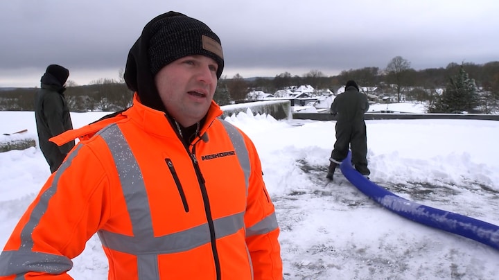 Daken dreigen te bezwijken onder het gewicht van de sneeuw. In Utrecht stortte gisteravond het dak van een sportcomplex in. Winkels zoals IKEA sluiten uit voorzorg, terwijl enorme stofzuigers zoals deze sneeuw van de daken zuigen.