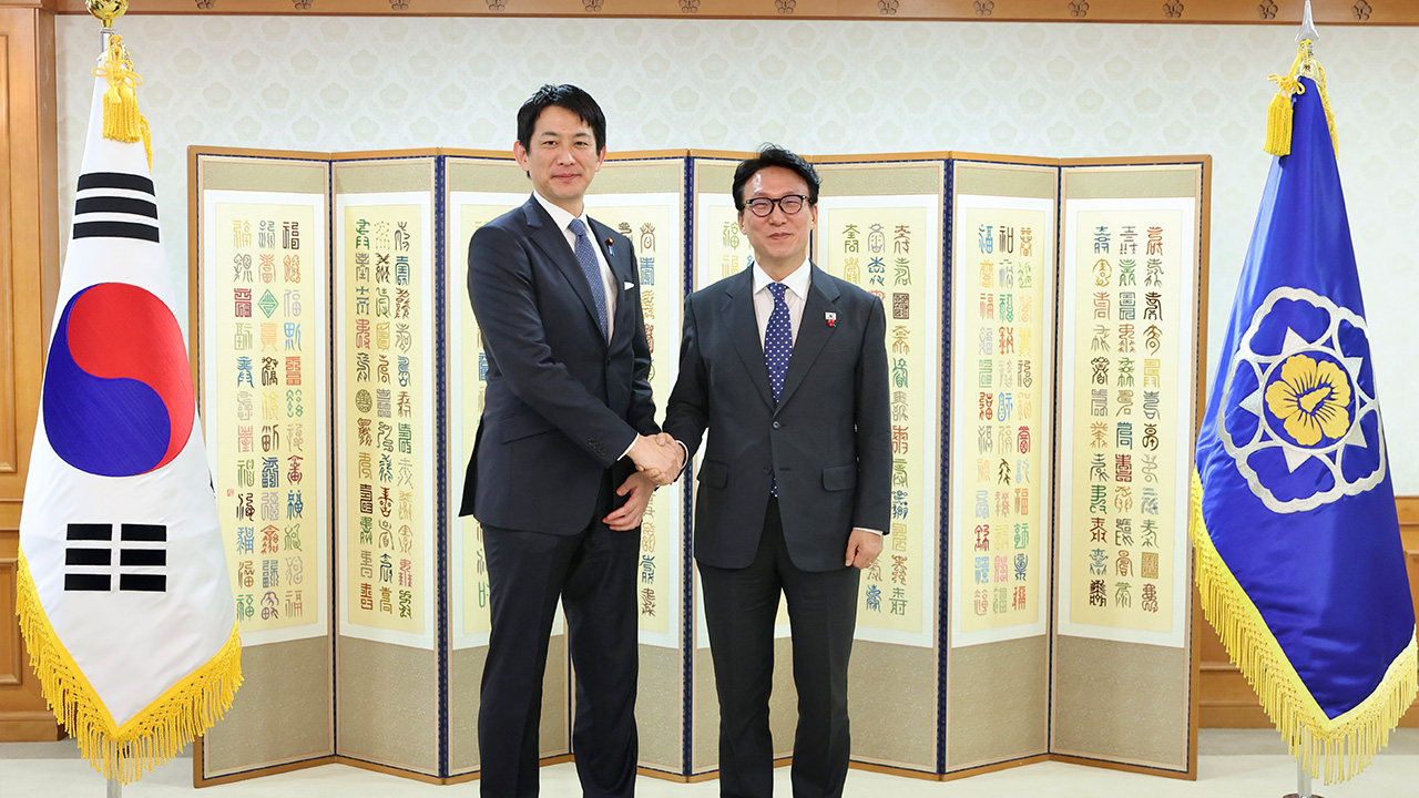 ▲ 김민석 국무총리가 8일 서울 종로구 정부서울청사에서 고바야시 다카유키 일본 자민당 정무조사회장을 접견하며 악수하고 있다.김민석 국…