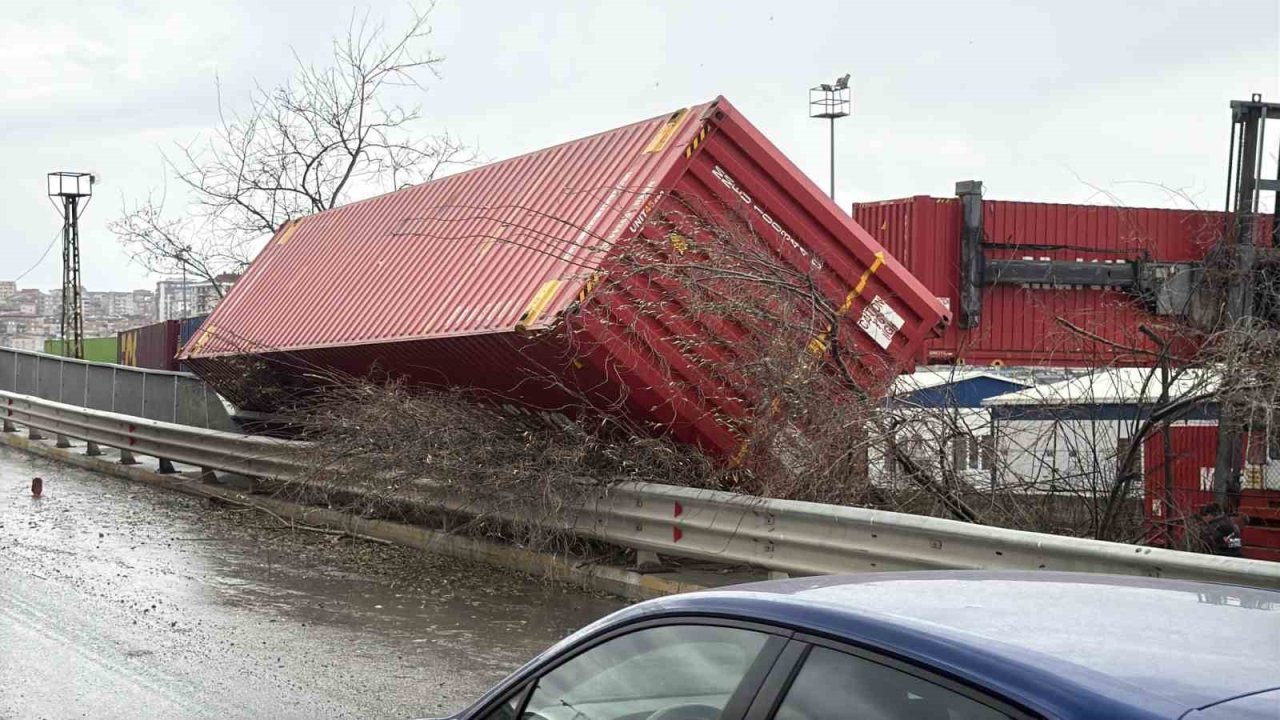 Küçükçekmece Halkalı eski gümrük sahasında şiddetli rüzgar konteynırları devirdi.