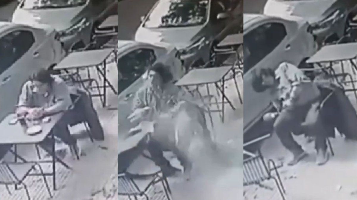 Una cámara de seguridad captó el momento exacto en que el elemento se desprendió de un balcón y golpeó a un hombre que estaba sentado tomando un café en la vereda.