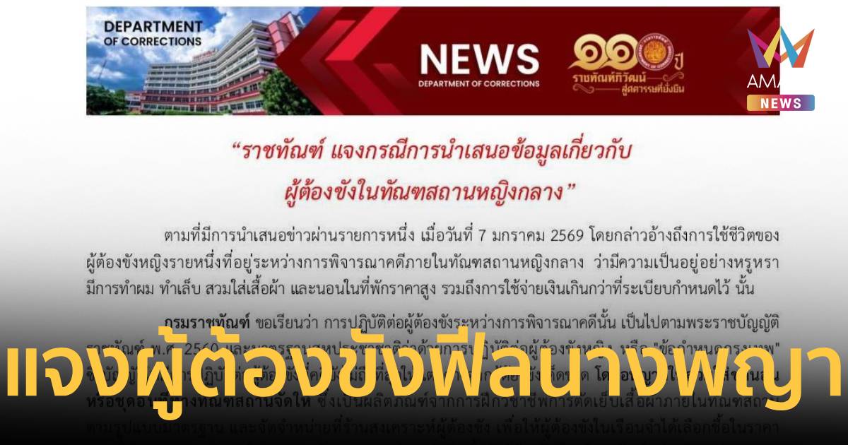 ราชทัณฑ์แจงแล้ว! กรณีการนำเสนอข้อมูลเกี่ยวกับ ผู้ต้องขังในทัณฑสถานหญิงกลาง อยู่คุกฟีลนางพญา ใช้ชีวิตหรูหรา ไม่เป็นความจริง