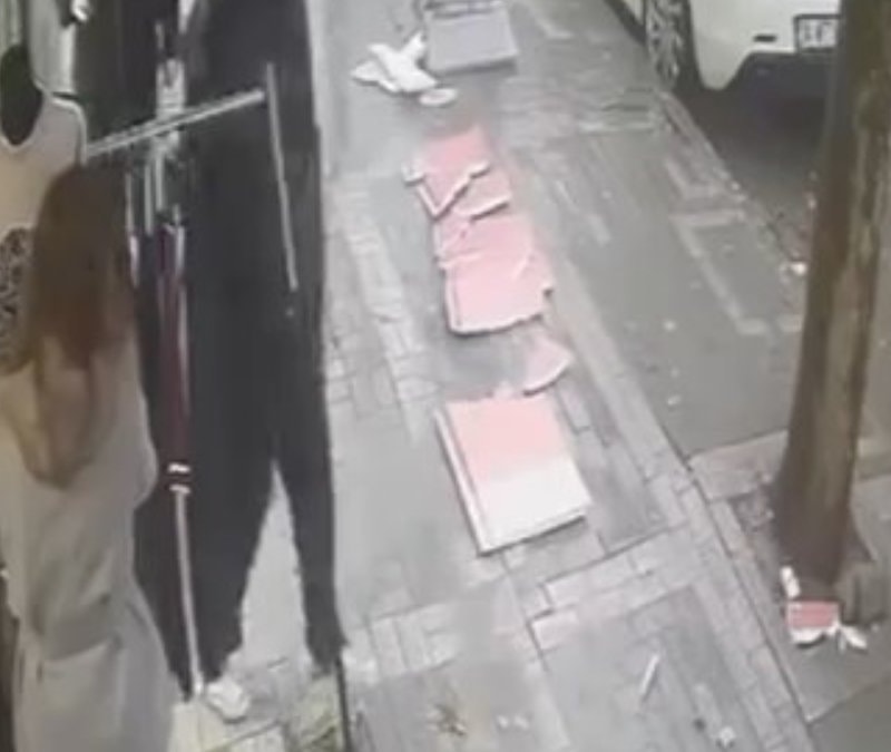 Avcılar'da bir mağazanın önünde kıyafetleri kontrol eden görevli, 4 katlı binanın çatısından rüzgar nedeniyle düşen parçalardan son anda kurtuldu. O anlar ise iş yerinin güvenlik kamerasına yansıdı.