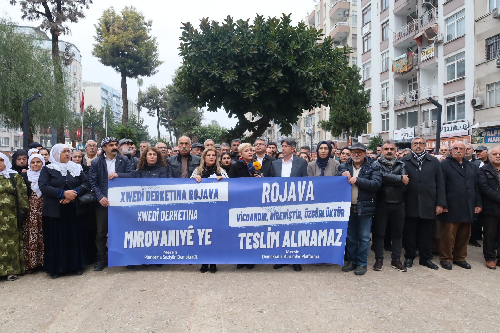 PİRHA- Mersin Demokratik Kurumlar Platformu’nun Suriye’deki saldırılara ilişkin yaptığı basın açıklamasında “Bugün Halep’te yaşananlar durdurulmazsa, yarın çok daha büyük yıkımların ve geri dönülmez kırılmaların önü açılacaktır” denildi. Mersin Demokratik Kurumlar Platformu, Halep’te Kürtlerin yoğun olarak yaşadığı Şêxmeqsûd ve Eşrefiye mahallelerine yönelik HTŞ saldırılarına ilişkin Özgür Çocuk Parkında basin açıklaması yaptı. Açıklamaya DEM Parti Mersin Milletvekilleri […] The post Mersin’de Halep’teki saldırılar protesto edildi- VİDEO appeared first on PİRHA .